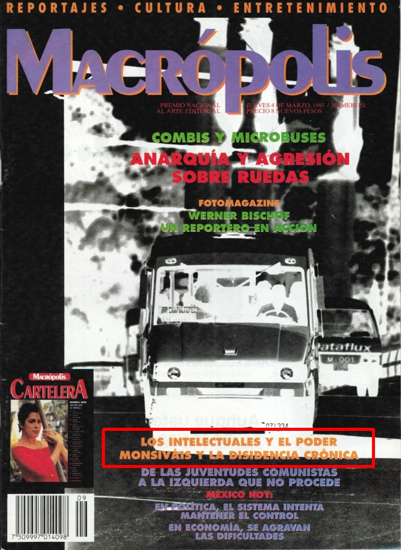 Calos Monsiváis ocupa un lugar especial en la literatura mexicana. En la prensa diaria y sus suplementos semanales (Excelsior, Novedades, El Día, Uno más uno, La Jornada), en las revistas (Proceso), en la radio, la televisión, analiza incansablemente los vericuetos de la vida política y cultural. (Publicación en francés)